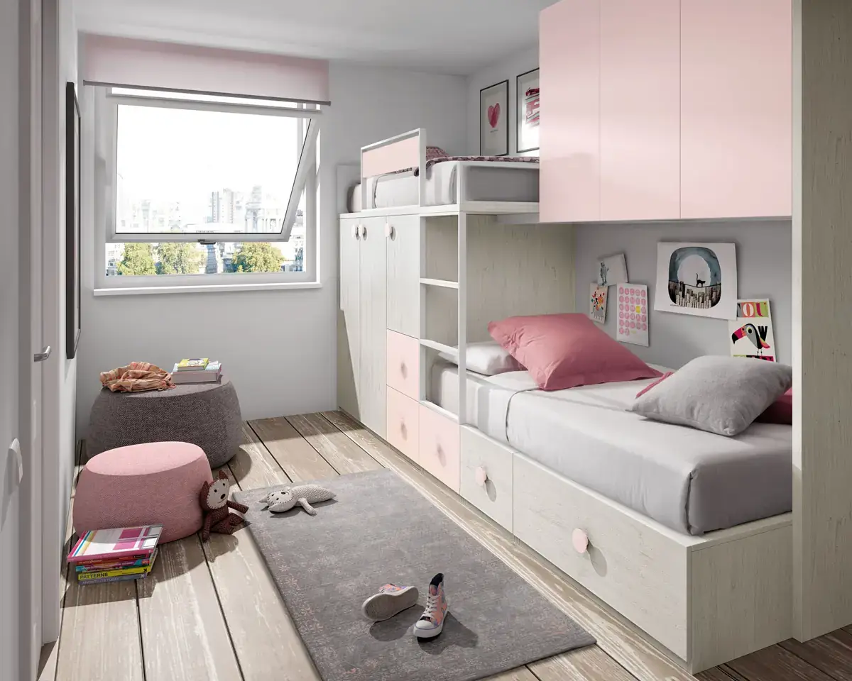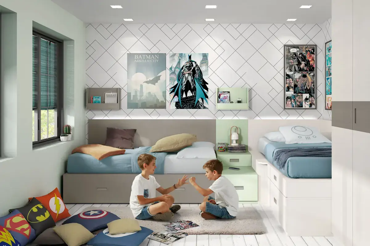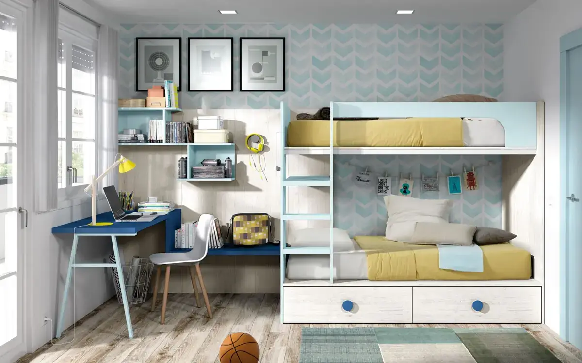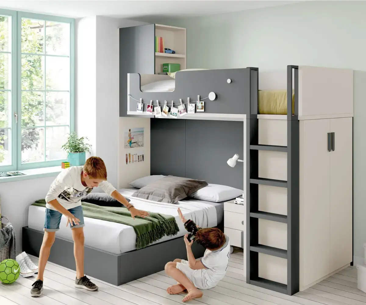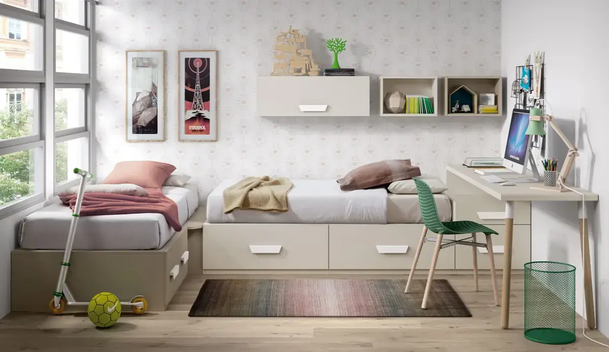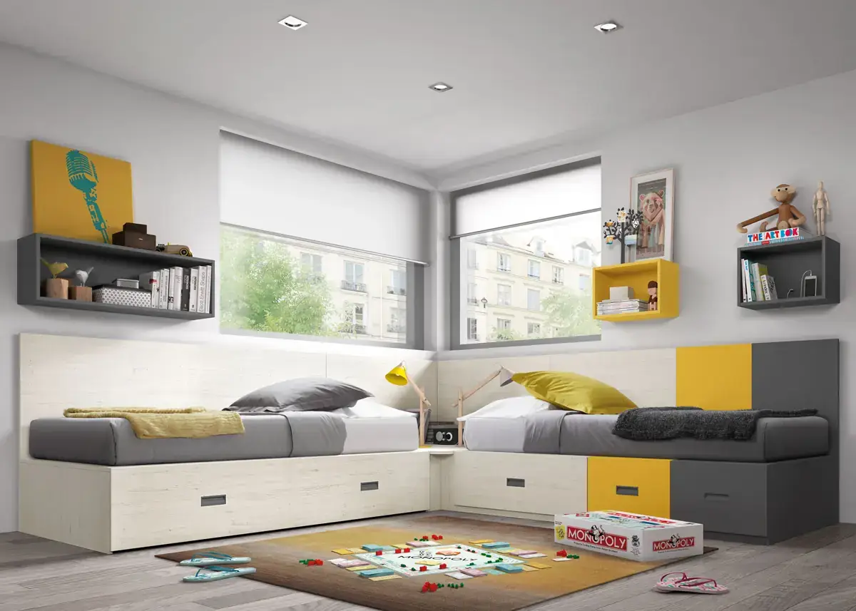 «Compartir habitación no tiene porque ser por necesidad y si una elección» El espacio compartido entre hermanos, incentivará los vínculos afectivos entre ellos y ayudará a generar una actitud más tolerante, respetuosa y considerada hacia los demás. A continuación, mostramos varias soluciones para dormitorios compartidos. Desde literas hasta camas individuales a diferentes alturas, pasando por trenes y literas abatibles, todo ello añadiendo espacios de estudio y soluciones en los rincones más insospechados dando valor al mobiliario a medida.