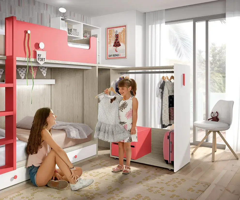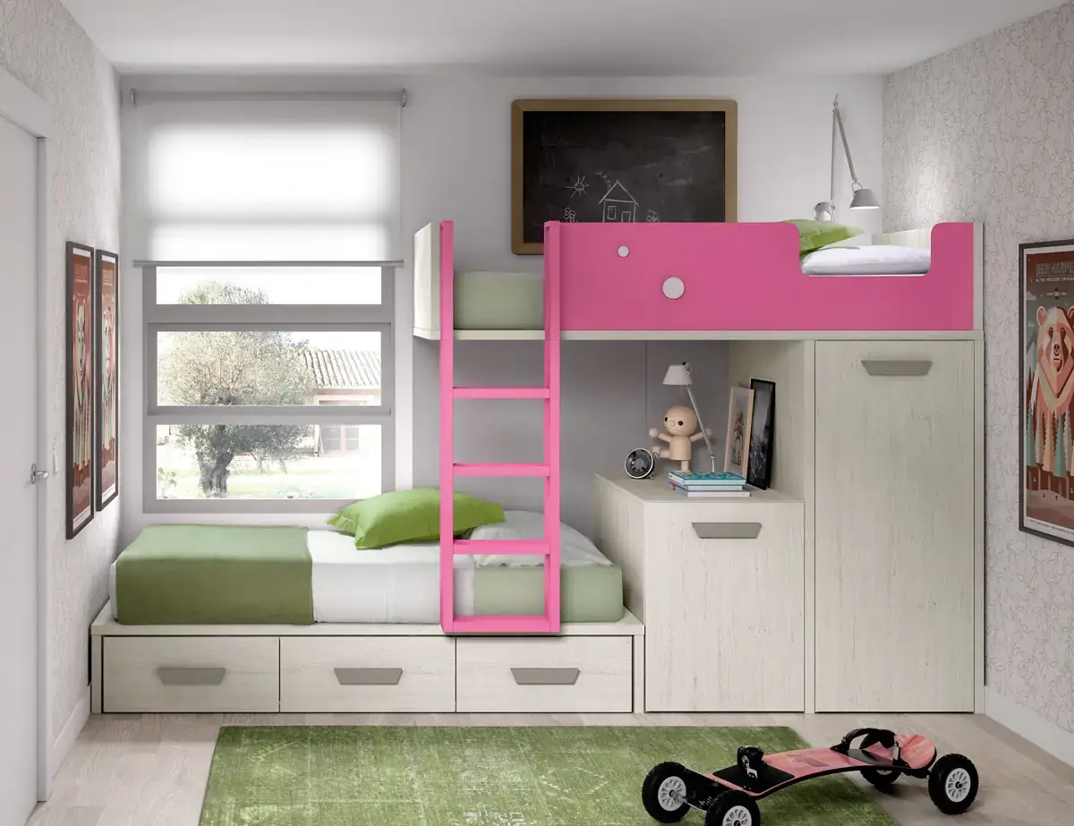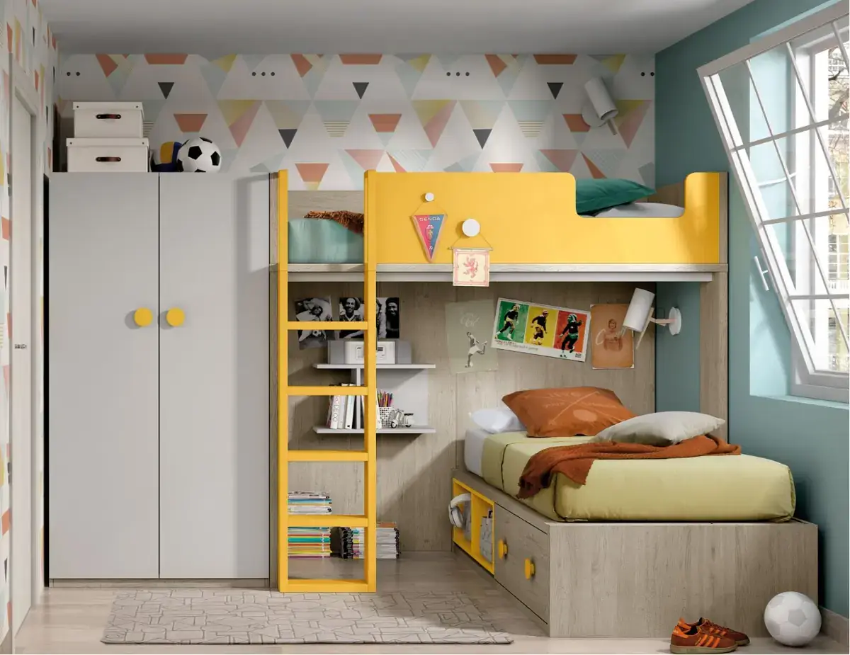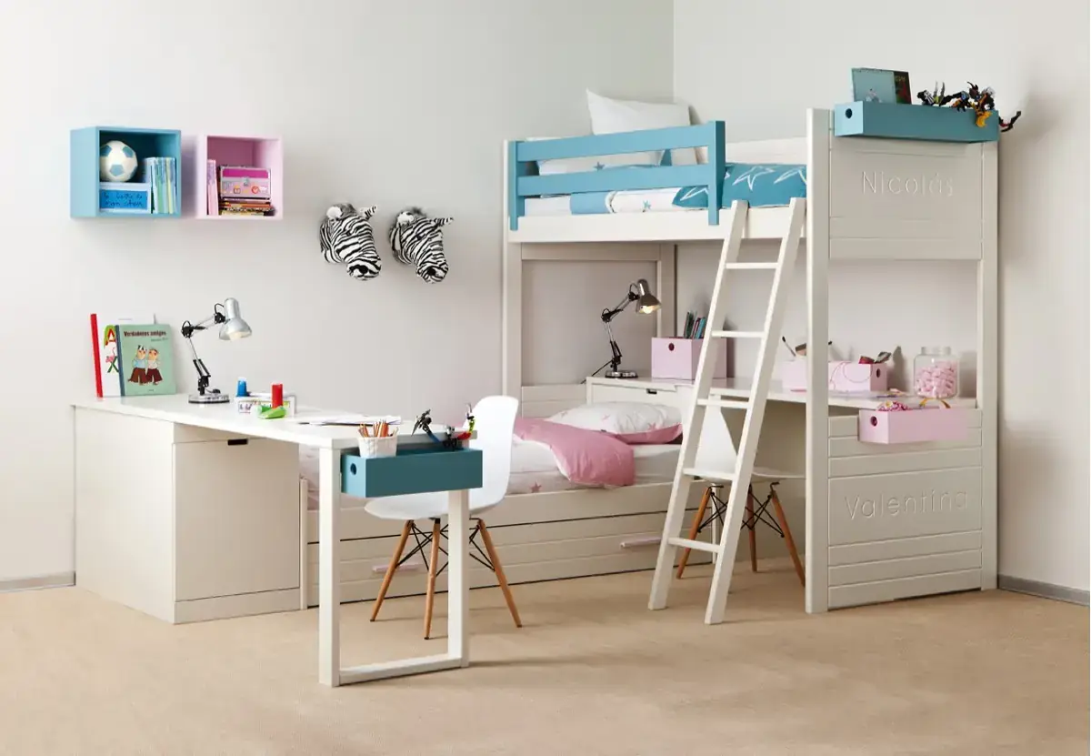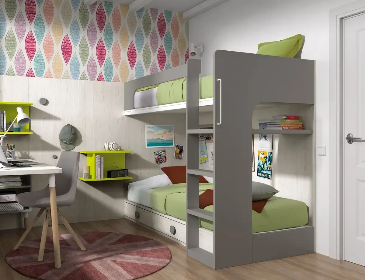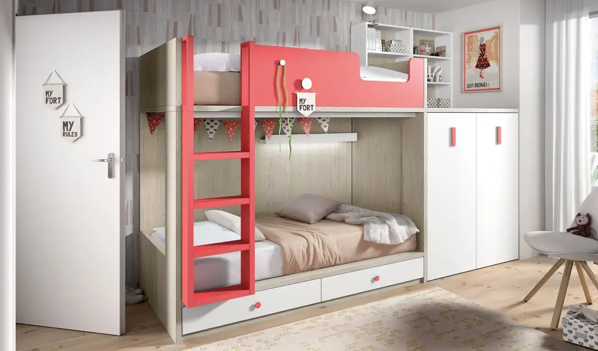 «Compartir habitación no tiene porque ser por necesidad y si una elección» El espacio compartido entre hermanos, incentivará los vínculos afectivos entre ellos y ayudará a generar una actitud más tolerante, respetuosa y considerada hacia los demás. A continuación, mostramos varias soluciones para dormitorios compartidos. Desde literas hasta camas individuales a diferentes alturas, pasando por trenes y literas abatibles, todo ello añadiendo espacios de estudio y soluciones en los rincones más insospechados dando valor al mobiliario a medida.
