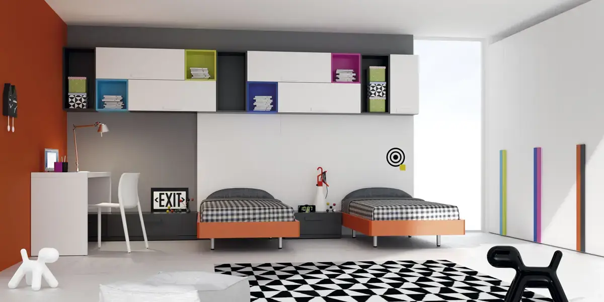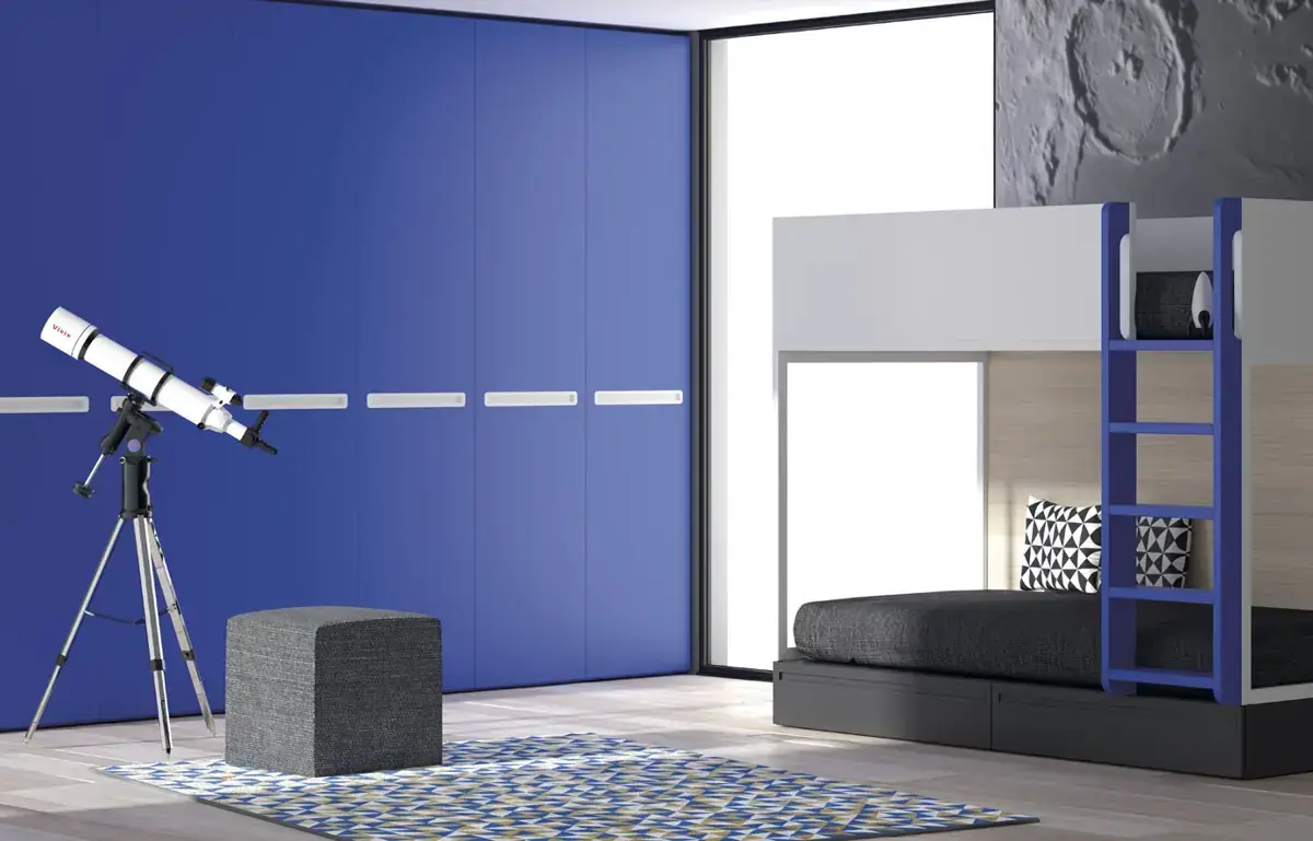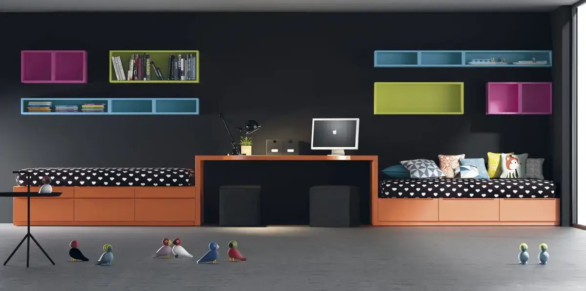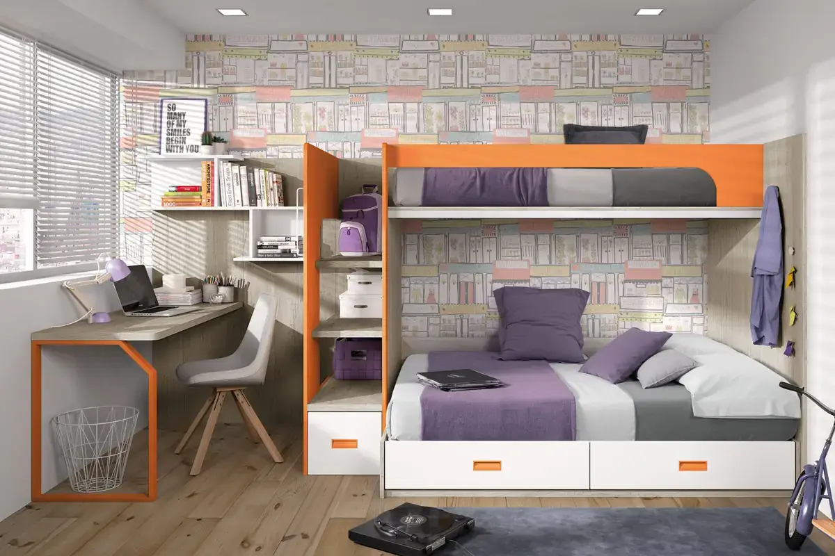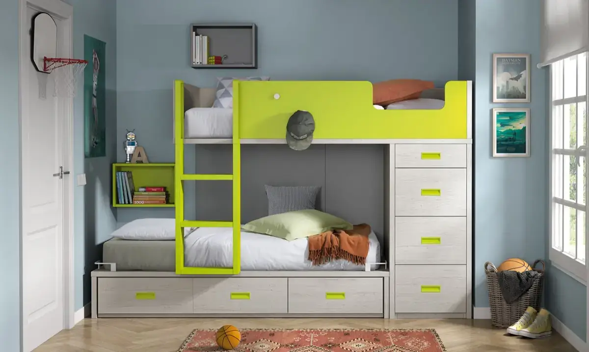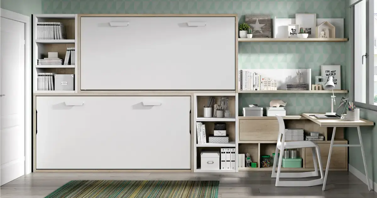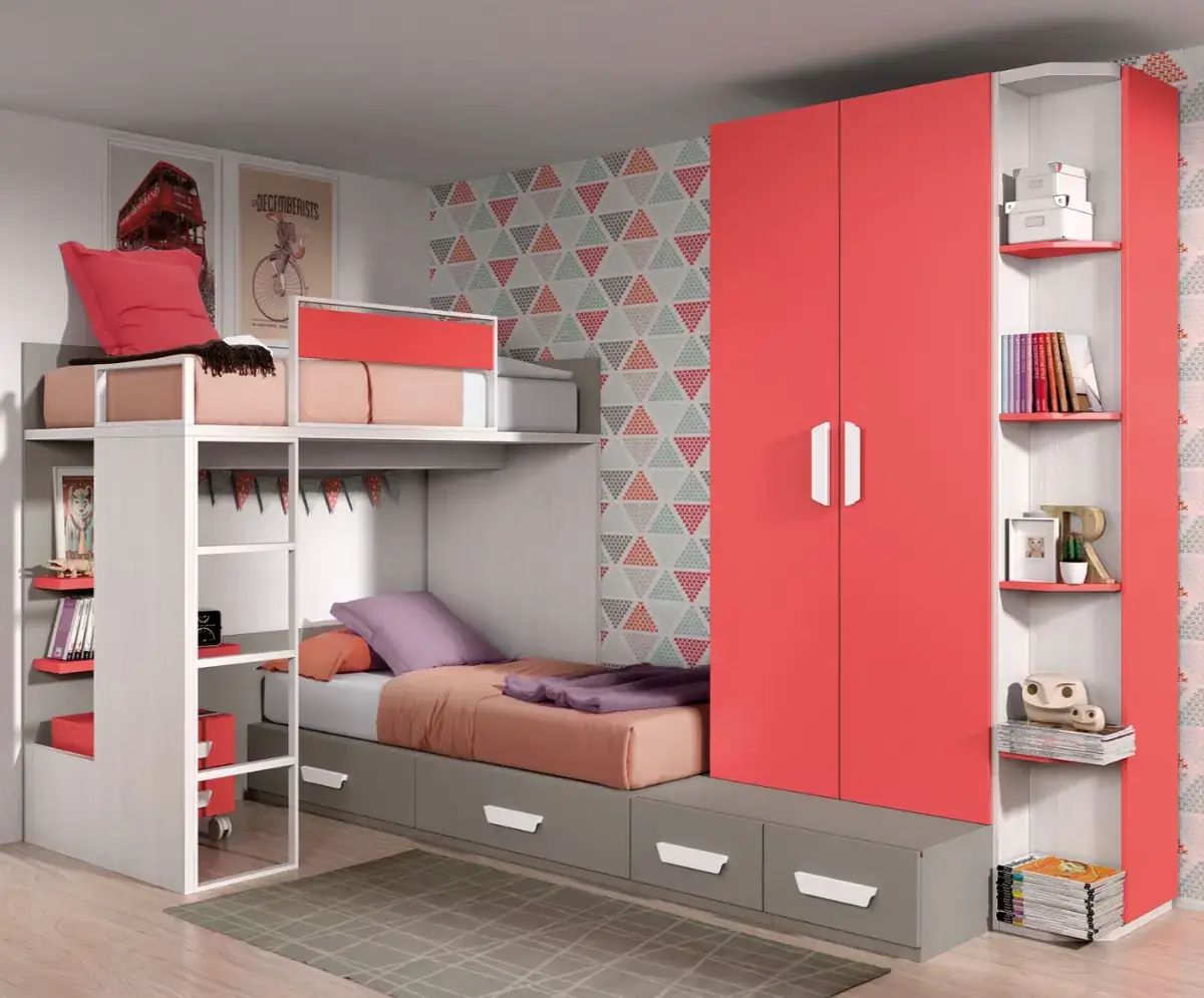 «Compartir habitación no tiene porque ser por necesidad y si una elección» El espacio compartido entre hermanos, incentivará los vínculos afectivos entre ellos y ayudará a generar una actitud más tolerante, respetuosa y considerada hacia los demás. A continuación, mostramos varias soluciones para dormitorios compartidos. Desde literas hasta camas individuales a diferentes alturas, pasando por trenes y literas abatibles, todo ello añadiendo espacios de estudio y soluciones en los rincones más insospechados dando valor al mobiliario a medida.