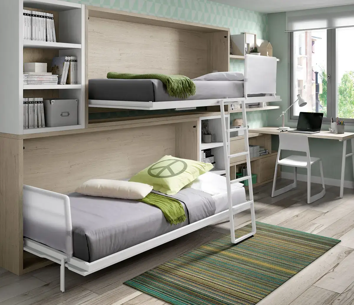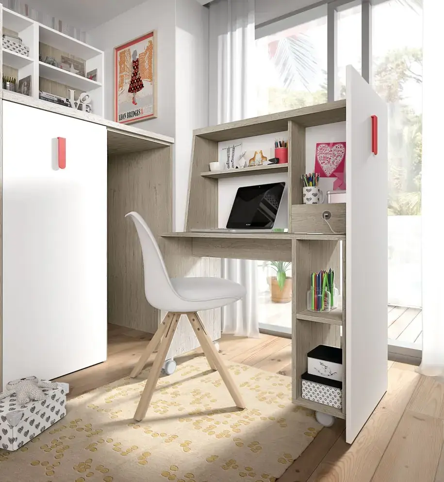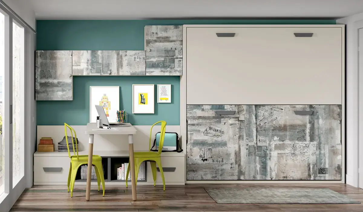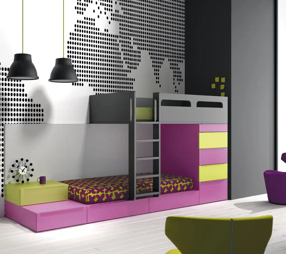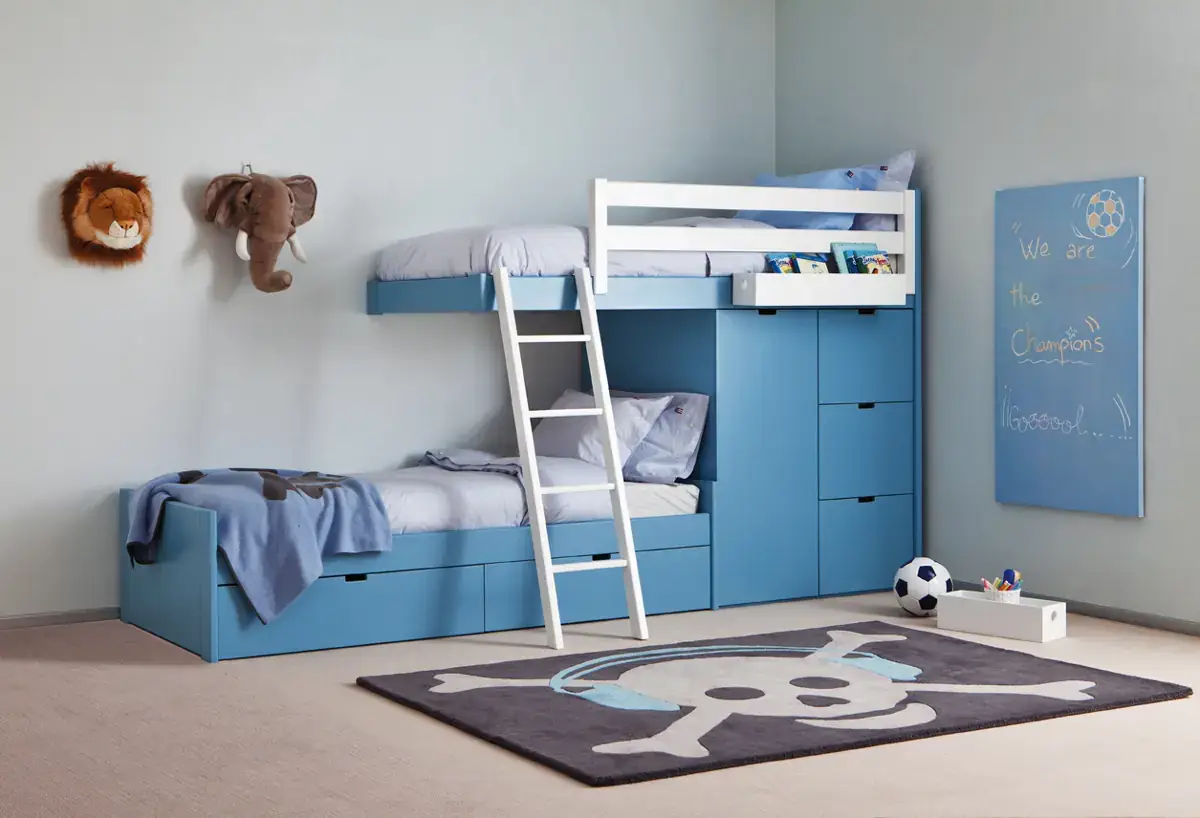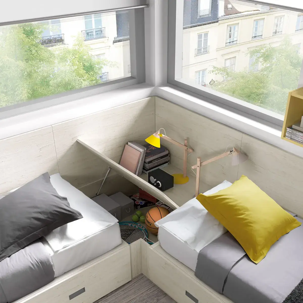 «Compartir habitación no tiene porque ser por necesidad y si una elección» El espacio compartido entre hermanos, incentivará los vínculos afectivos entre ellos y ayudará a generar una actitud más tolerante, respetuosa y considerada hacia los demás. A continuación, mostramos varias soluciones para dormitorios compartidos. Desde literas hasta camas individuales a diferentes alturas, pasando por trenes y literas abatibles, todo ello añadiendo espacios de estudio y soluciones en los rincones más insospechados dando valor al mobiliario a medida.