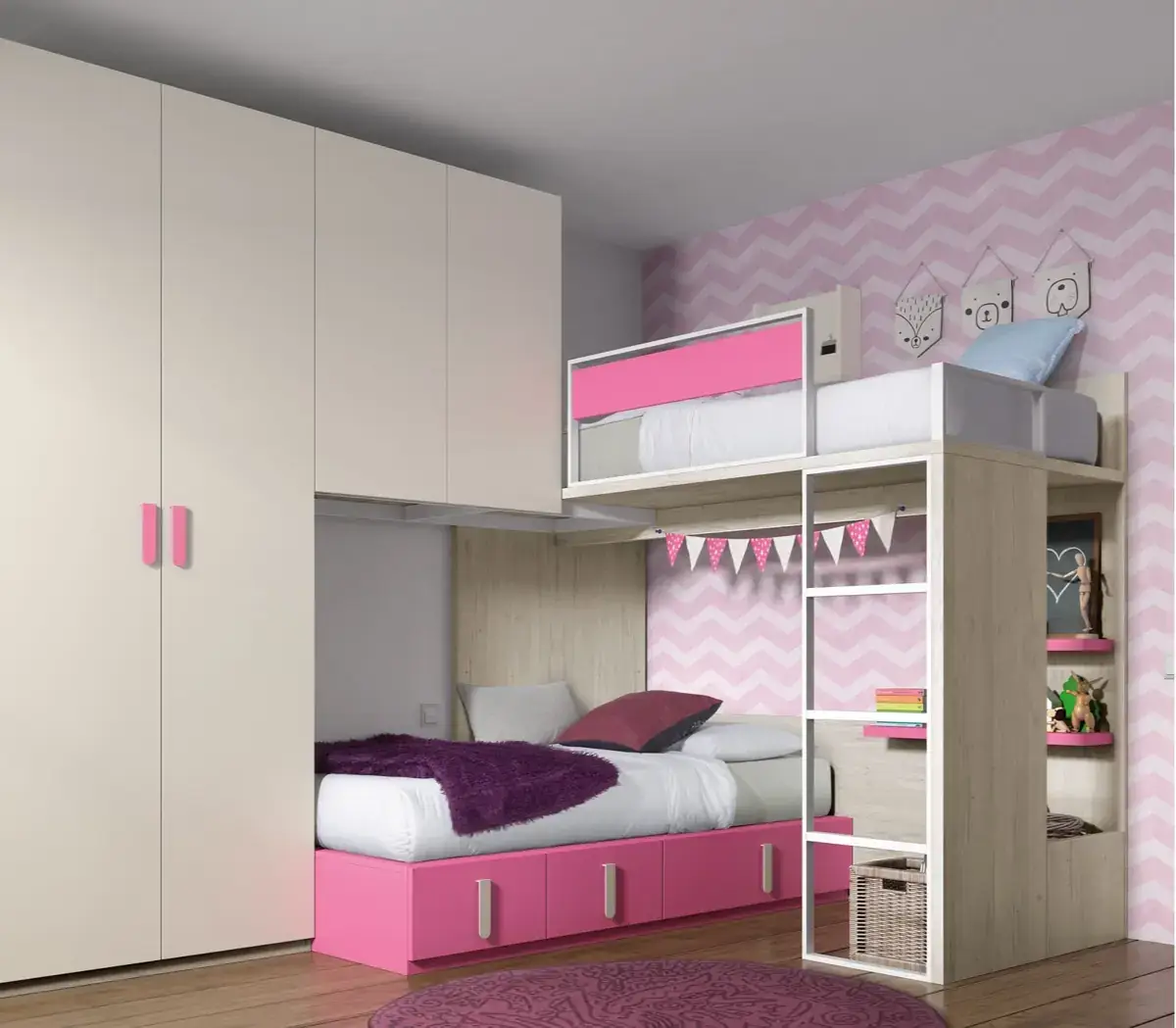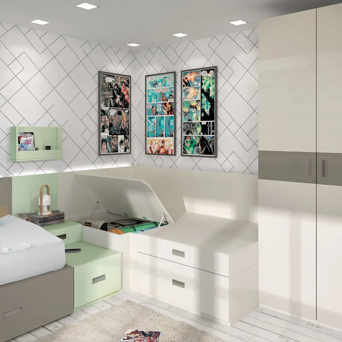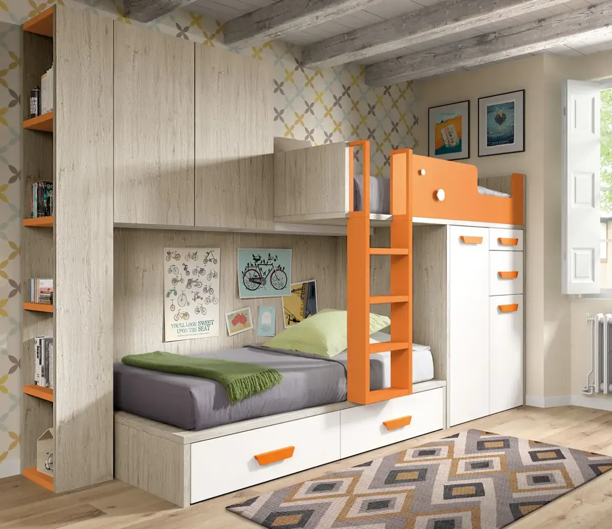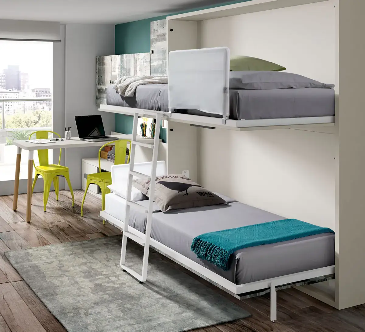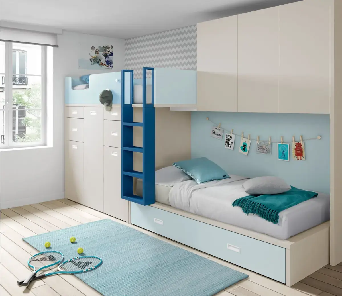 «Compartir habitación no tiene porque ser por necesidad y si una elección» El espacio compartido entre hermanos, incentivará los vínculos afectivos entre ellos y ayudará a generar una actitud más tolerante, respetuosa y considerada hacia los demás. A continuación, mostramos varias soluciones para dormitorios compartidos. Desde literas hasta camas individuales a diferentes alturas, pasando por trenes y literas abatibles, todo ello añadiendo espacios de estudio y soluciones en los rincones más insospechados dando valor al mobiliario a medida.